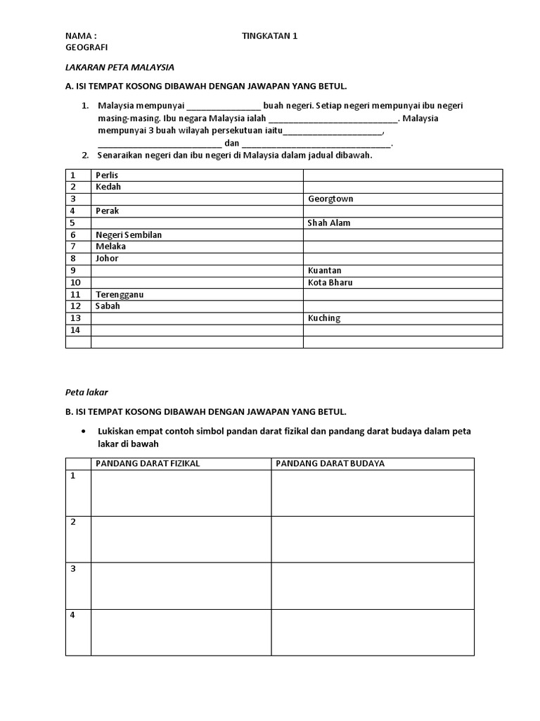 Latihan Geografi Tingkatan Satu Worksheet